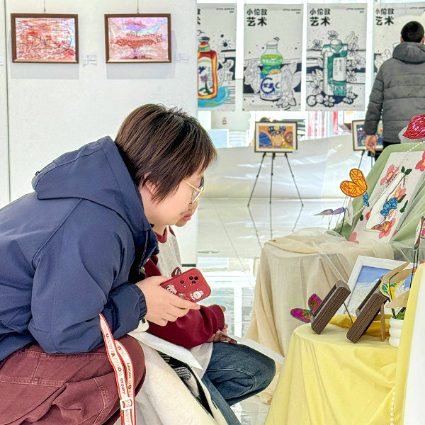 孩子们则在画作前流连,兴奋地向同伴介绍自己的创作灵感,现场洋溢着自豪与喜悦的氛围。